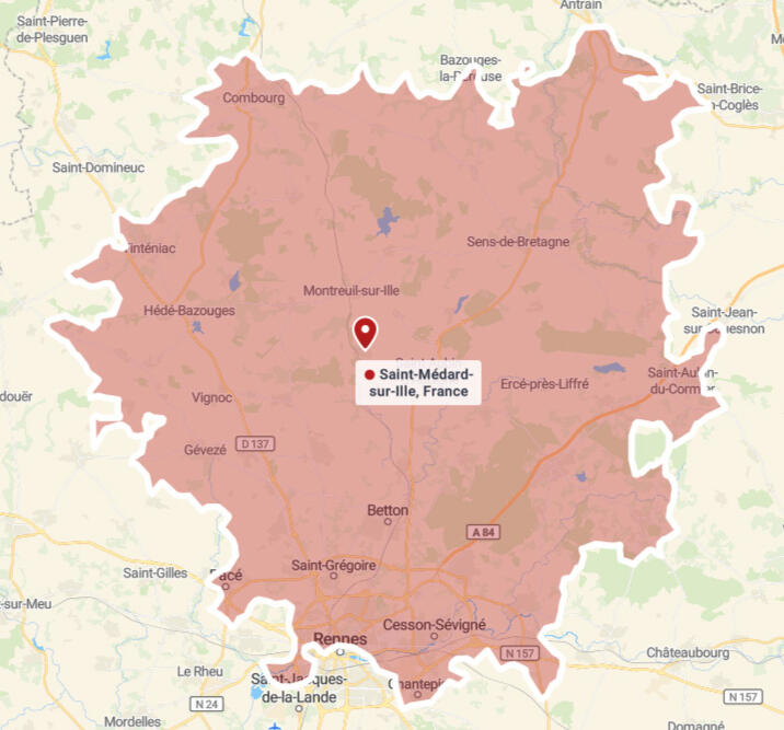 Secteur : Basé à Saint-Médard-sur-Ille, j'interviens dans un rayon de 30 minutes environ (voir carte ci-dessous).Cela comprend notamment les zones de Rennes Nord, Betton, Melesse, Saint-Aubin-d'Aubigné, Combourg et Liffré.